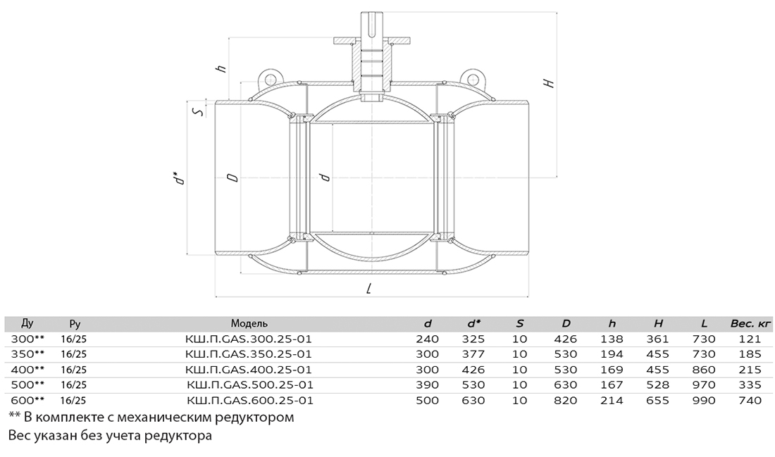 Кран шаровой газовый ALSO КШ.П.GAS.500.16-01 Ду 500 Ру 16 с редуктором стандартнопроходный под приварку