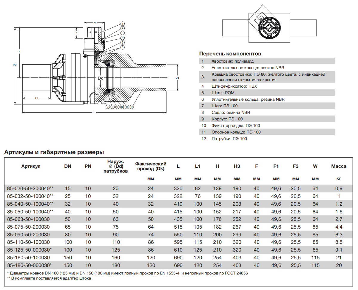 Кран шаровый AVK 85/50 DN 32 PN 10 полиэтиленовый полнопроходный
