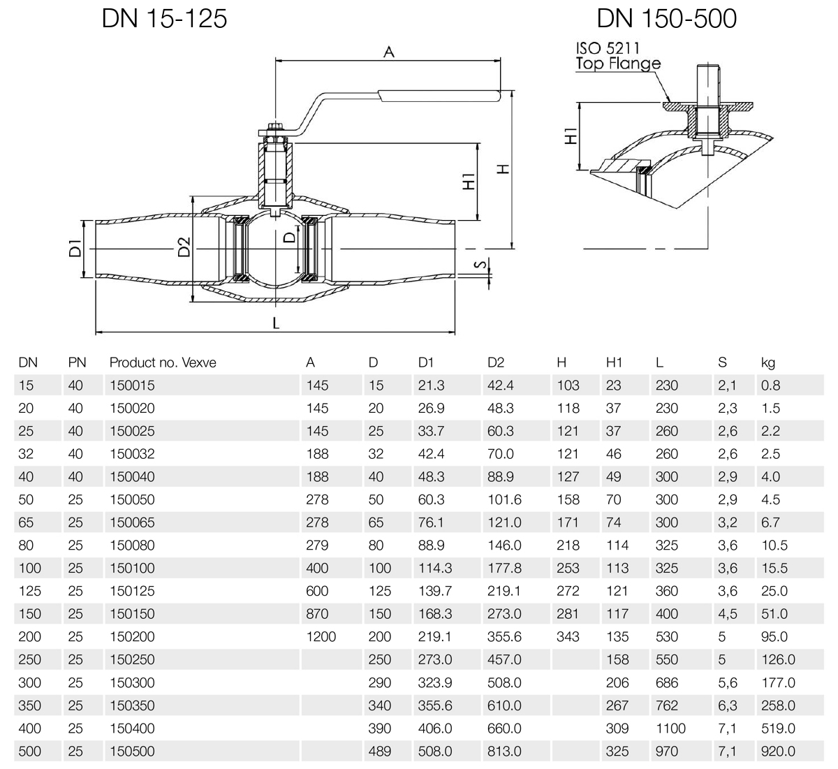 Кран шаровой Vexve 150015 DN 15 PN 40 стальной полнопроходный под приварку для воды, ручка-рычаг