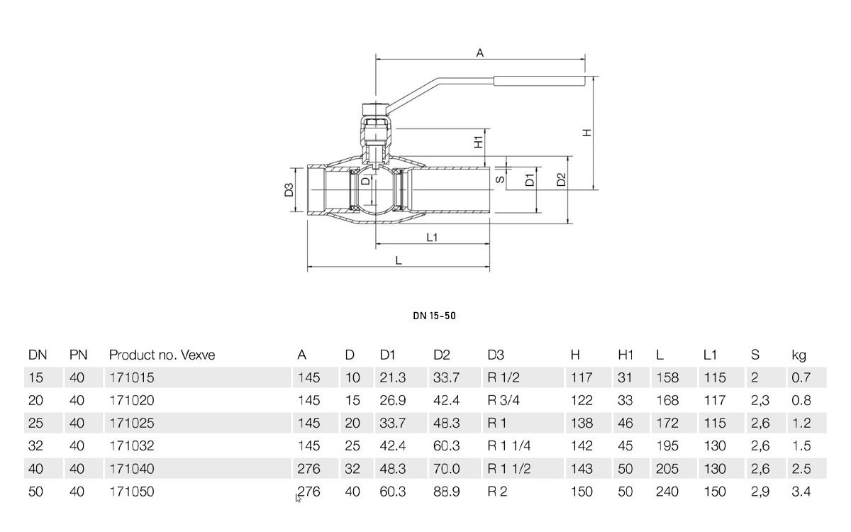 Кран шаровой Vexve 171015 DN 15 PN 40 стальной стандартнопроходный резьбовой/под приварку для пара, ручка-рычаг