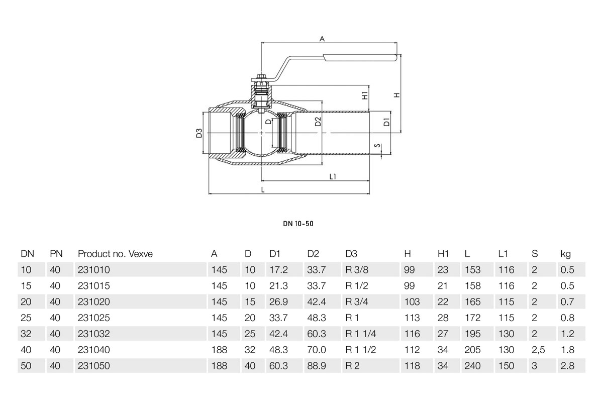 Кран шаровой Vexve 231020 DN 20 PN 40 стальной стандартнопроходный резьбовой/под приварку для жидкости, ручка-рычаг