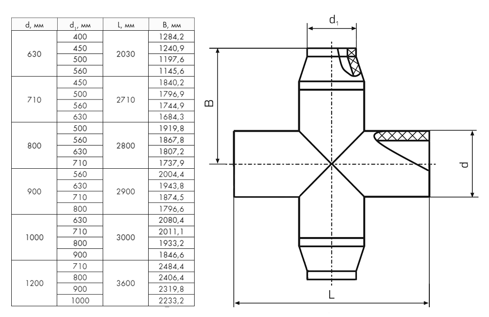 Крестовина 1200х710 мм SDR11 90° ПЭ100 неравнопроходная сварная сегментная ПНД