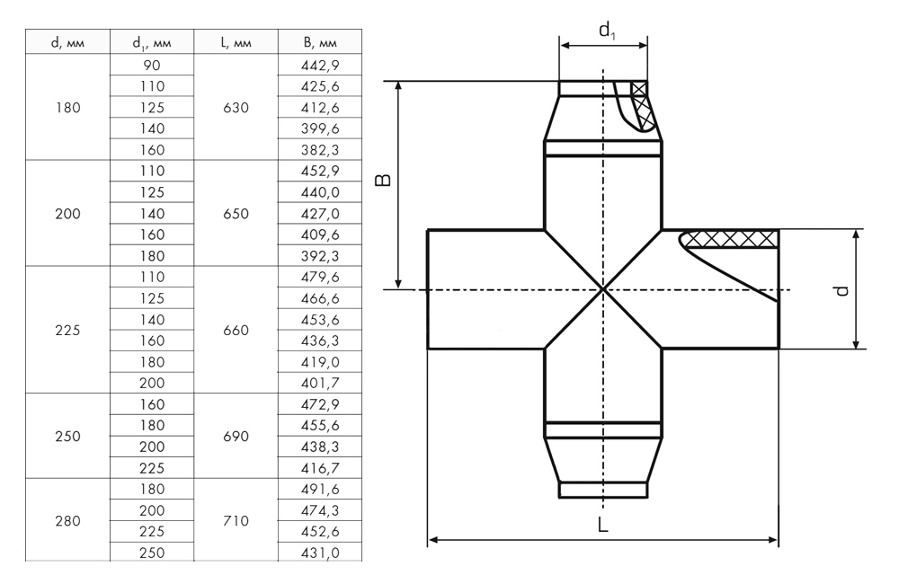 Крестовина 250х225 мм SDR21 90° ПЭ100 неравнопроходная сварная сегментная ПНД