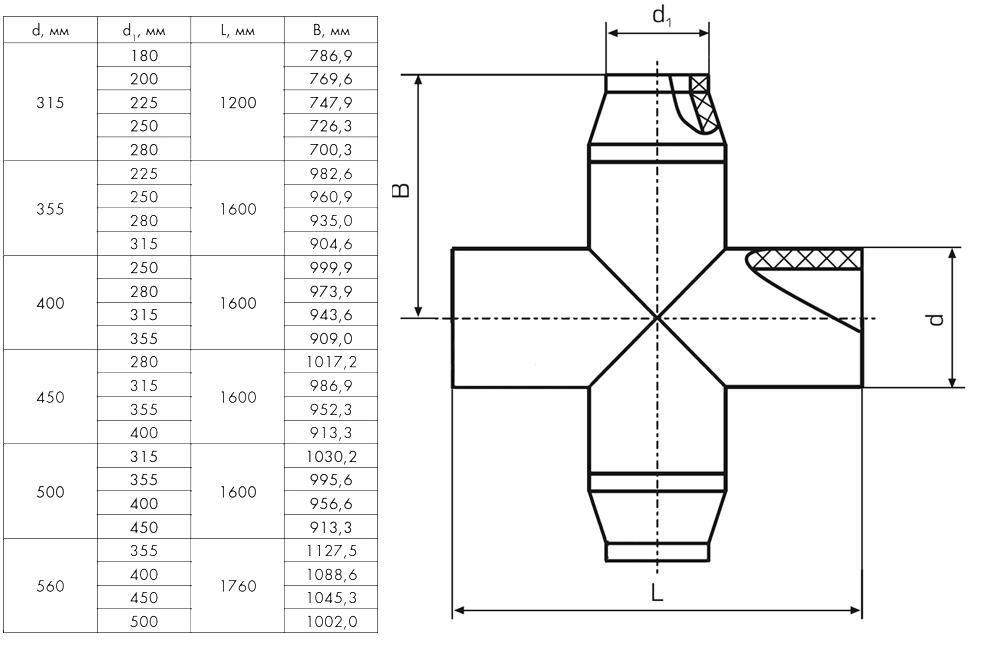 Крестовина 560х355 мм SDR13,6 90° ПЭ100 неравнопроходная сварная сегментная ПНД