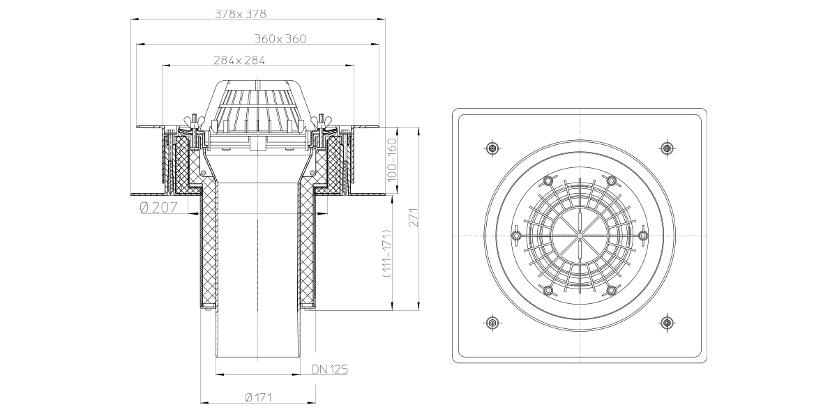 Кровельная воронка HL63/2 DN 125 с монтажным коробом для кровель из профлиста