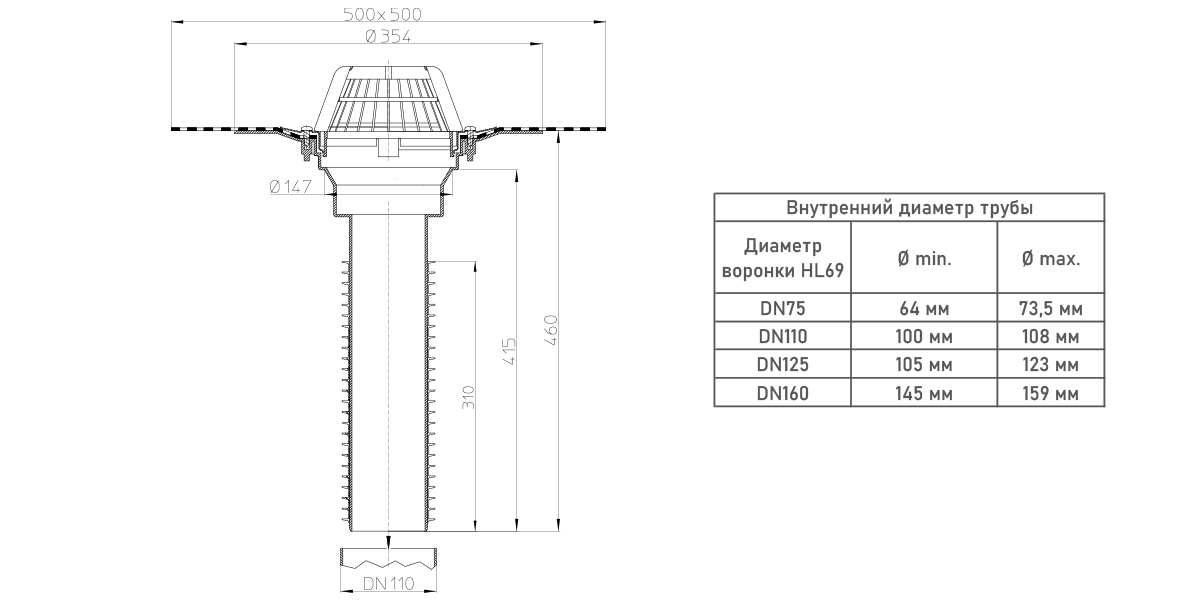 Кровельная воронка HL69H/1 DN 110 универсальная с полимербитумным полотном с вертикальным выпуском