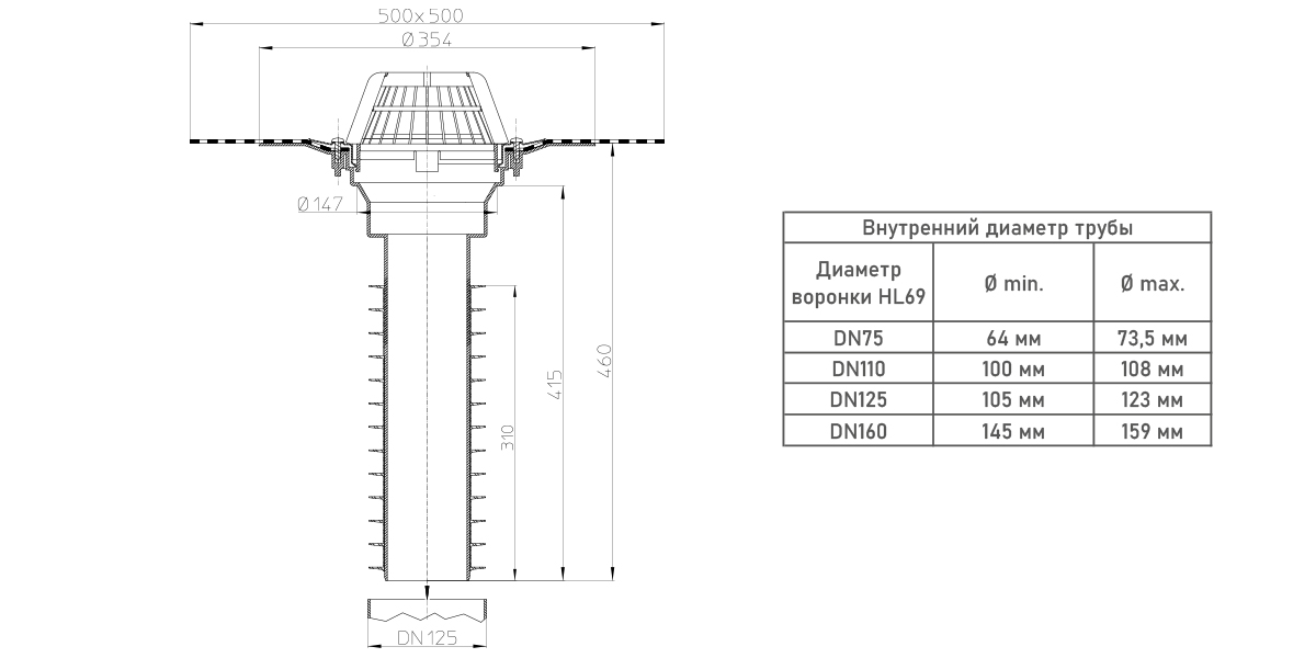 Кровельная воронка HL69H/2 DN 125 универсальная с полимербитумным полотном с вертикальным выпуском