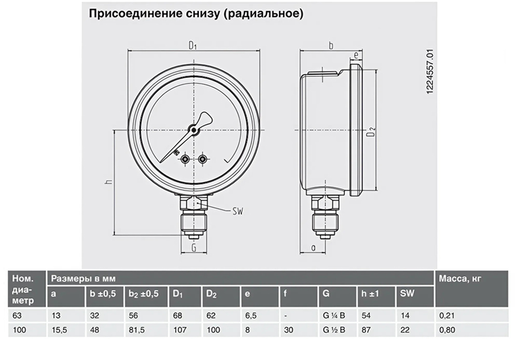 Манометр гидрозаполненный 213.53.63 радиальный Дк63мм 0-0,6 бар кл.1,6 G1/4" глицерин Wika 31104197