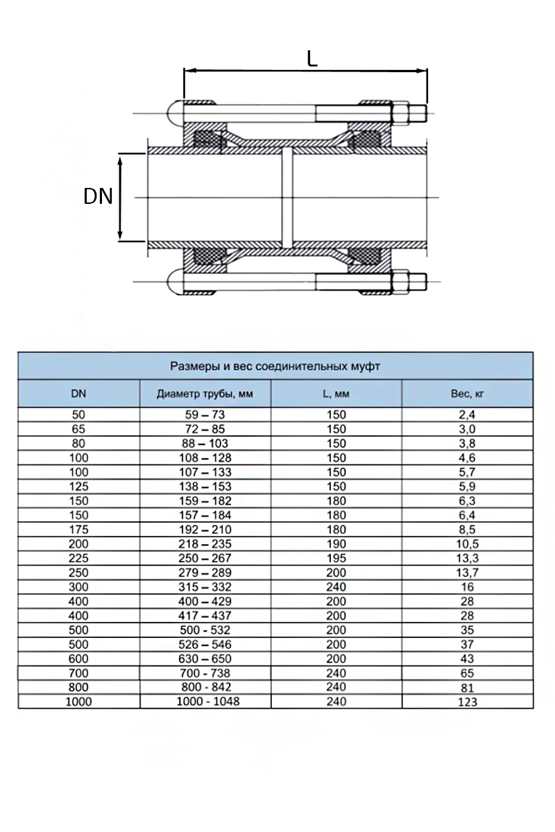 Муфта обжимная ДРК Ду 700 (700-738 мм) соединительная для чугунных и стальных труб