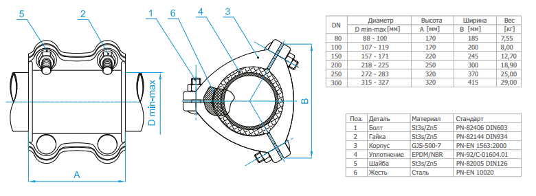 Муфта ремонтная трехсоставная DOMEX UUU DN 80 (88-100) мм PN 16 чугунная