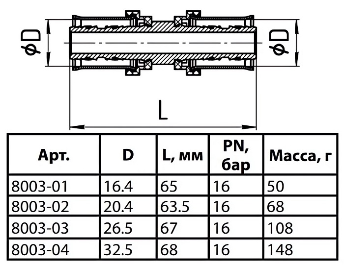 Муфта соединительная латунная Aquasfera 8003 DN 20.4 PN 16, покрытие - никель, пресс, 8003-02