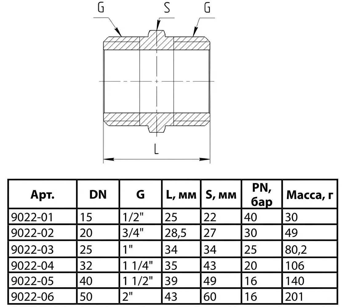 Ниппель латунный Aquasfera 9022 DN 32 PN 20 резьба - 1 1/4'', покрытие - никель, прямой резьбовой НР-НР, 9022-04