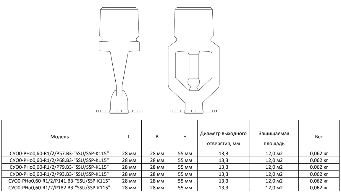 Ороситель спринклерный СУО0-РНо0,60-R1/2/Р79.В3-"SSP-K115" водяной и пенный с резьбовым герметиком