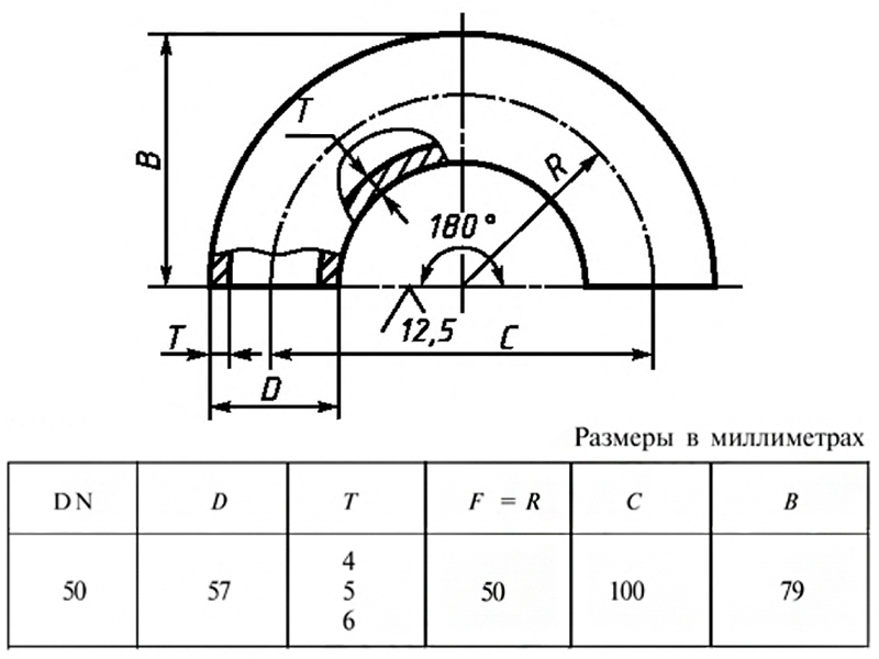 Отвод 180-57х4,0-12Х18Н10Т ГОСТ 30753-2001 стальной бесшовный крутоизгогнутый