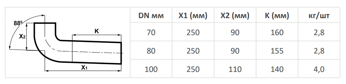 Отвод 88° с удлинительной стороной 250 мм SML DN 70 мм чугунный