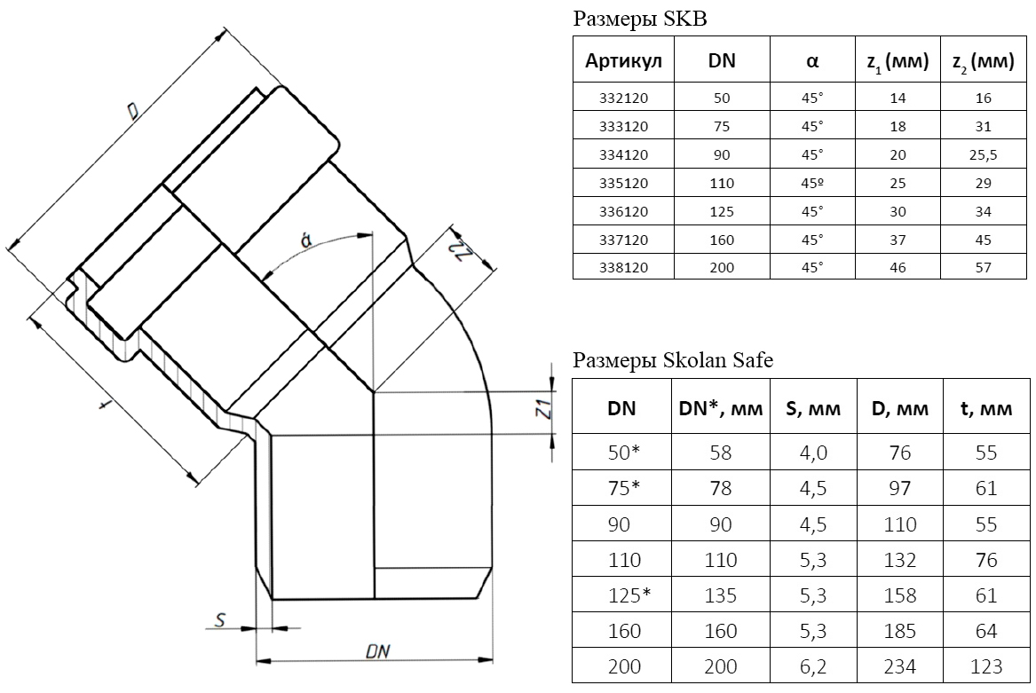 Отвод канализационный бесшумный PP-MD Ostendorf Skolan Safe SKB DN 75х45°