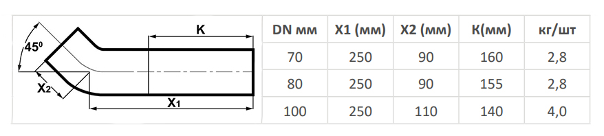 Отвод (колено) 45° с удлиненной стороной (250 мм) SML DN 100 мм чугунный