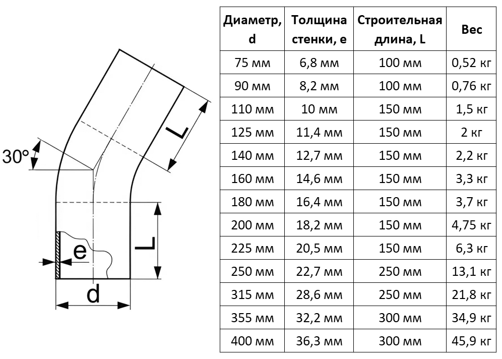 Отвод литой 200 мм 30 градусов SDR 11 ПЭ100 для ПНД труб спигот