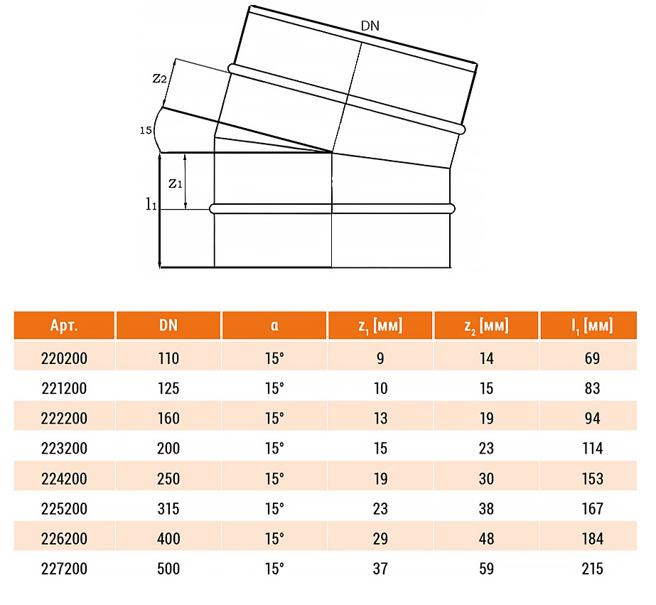 Отвод НПВХ Ostendorf KG KGB DN 125 PN 0,5 15 градусов