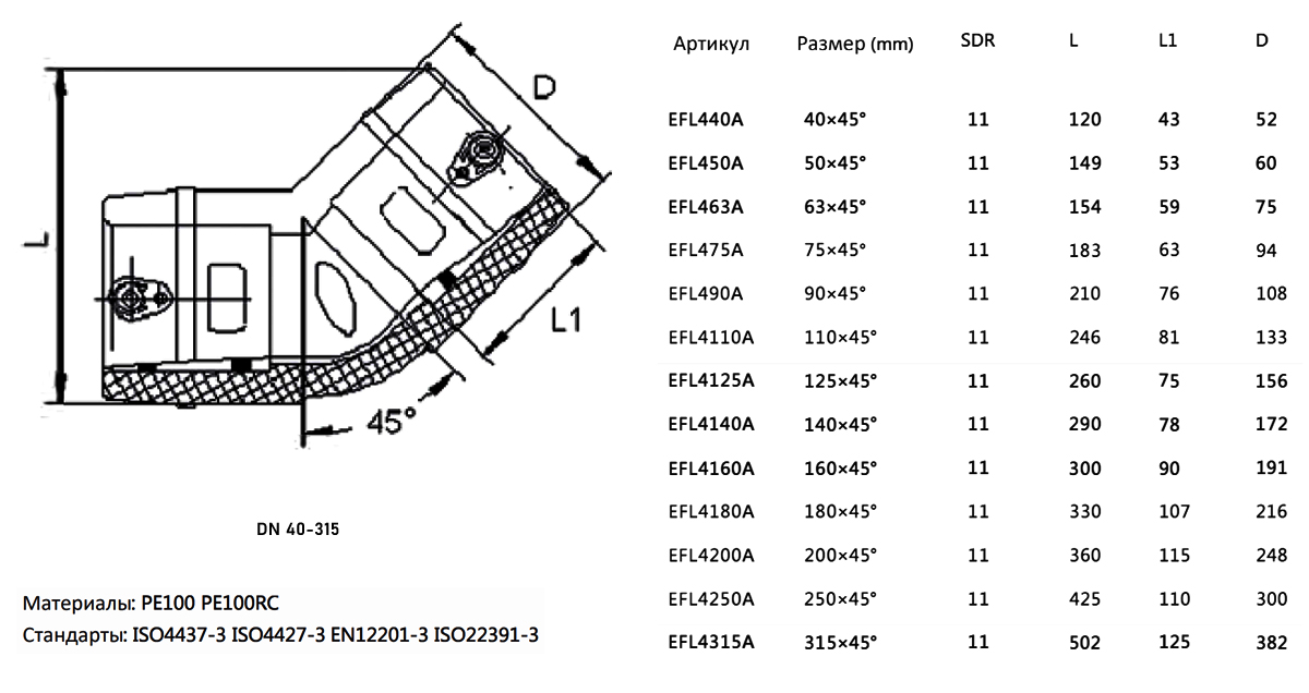 Отвод ПЭ100 э/с 40мм 45 градусов SDR 11 SMART-JOINT электросварной