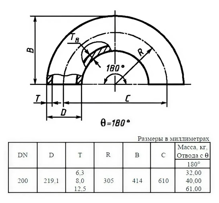 Отвод стальной 180-1-219,1х6,3-09Г2С ГОСТ 17375-2001 бесшовный крутоизогнутый