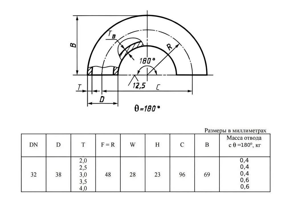 Отвод стальной 180-2-38х3,5-12Х18Н10Т ГОСТ 17375-2001 бесшовный крутоизогнутый