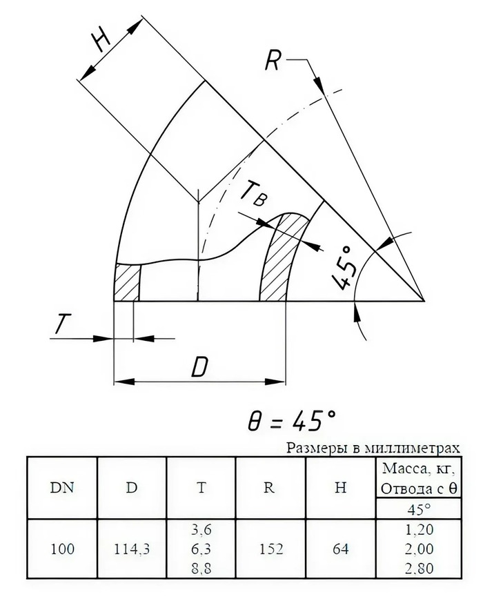 Отвод стальной 45-1-114,3х3,6-09Г2С ГОСТ 17375-2001 бесшовный крутоизогнутый