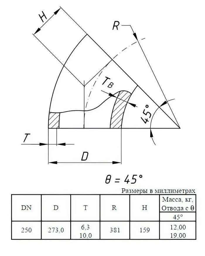 Отвод стальной 45-1-273х10-09Г2С ГОСТ 17375-2001 бесшовный крутоизогнутый