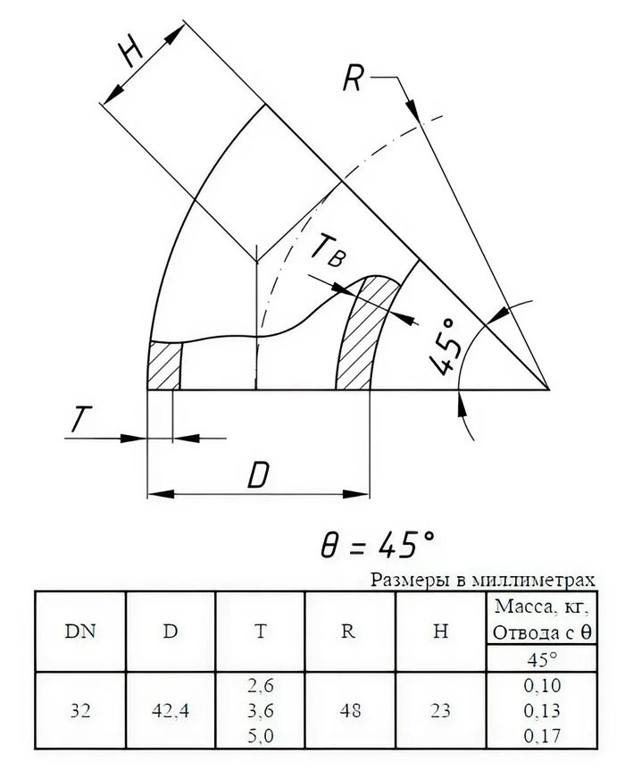Отвод стальной 45-1-42,4х2,6-Ст.20 ГОСТ 17375-2001 бесшовный крутоизогнутый