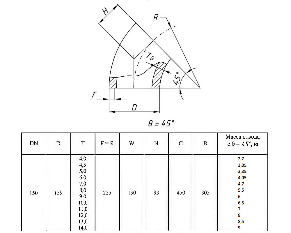 Отвод стальной 45-2-159х8-09Г2С ГОСТ 17375-2001 бесшовный крутоизогнутый