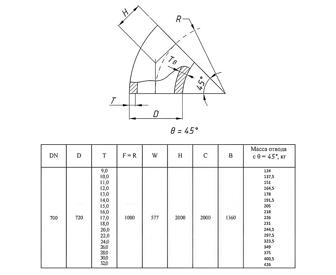Отвод стальной 45-2-720х11-12Х18Н10Т ГОСТ 17375-2001 бесшовный крутоизогнутый