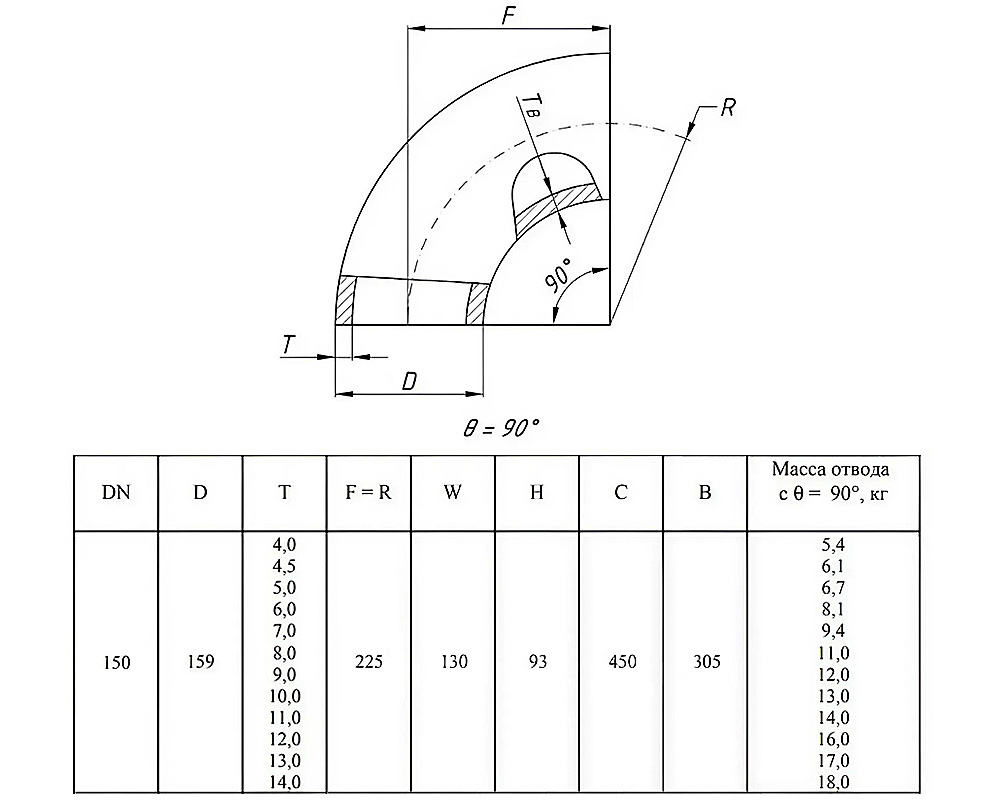 Отвод стальной 90-2-159х13-12Х18Н10Т ГОСТ 17375-2001 бесшовный крутоизогнутый
