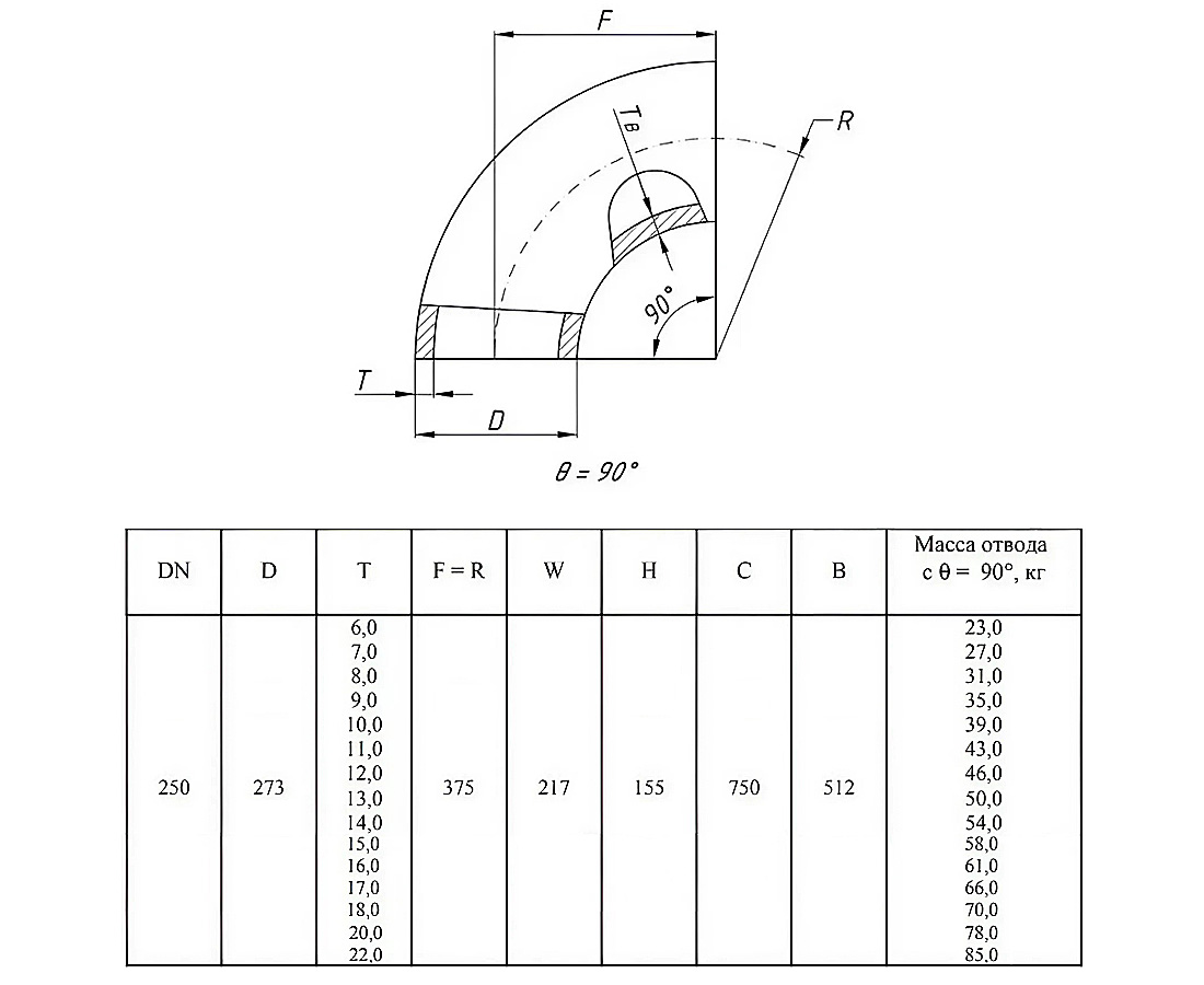 Отвод стальной 90-2-273х13-09Г2С ГОСТ 17375-2001 бесшовный крутоизогнутый