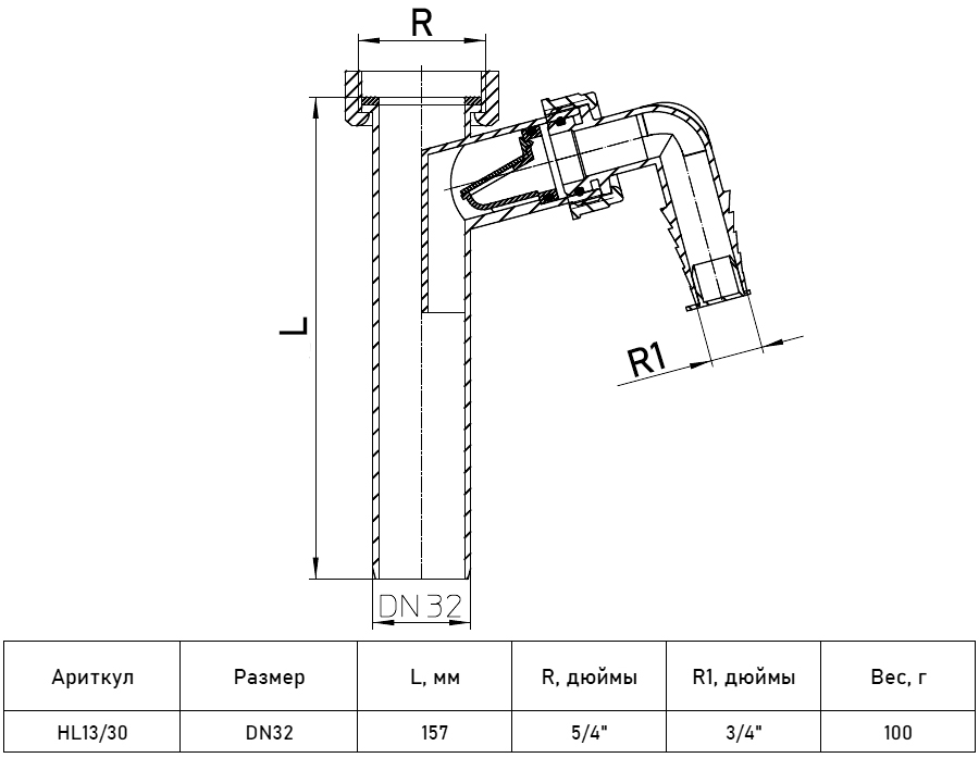 Патрубок-удлинитель со штуцером HL13/30 DN32х5/4" для подкл. стиральной и посудомоечной машин