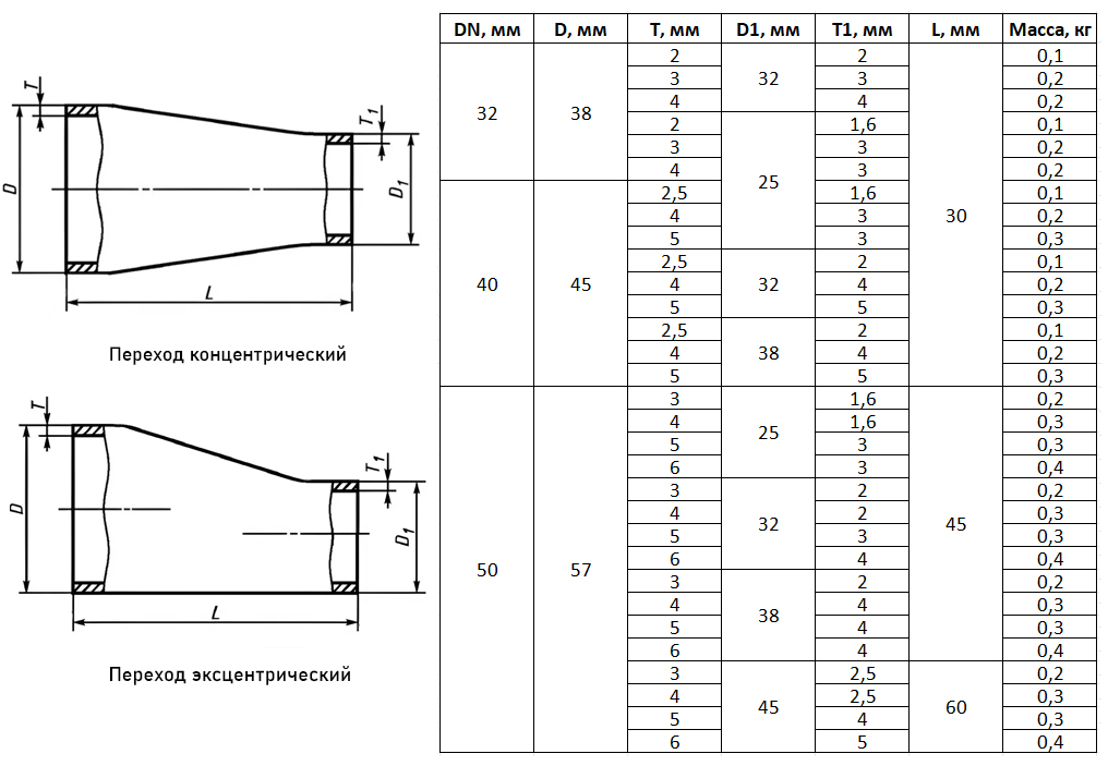 Переход стальной нержавеющий эксцентрический Э-57х5-45х4-12Х18Н10Т ГОСТ 17378-2001