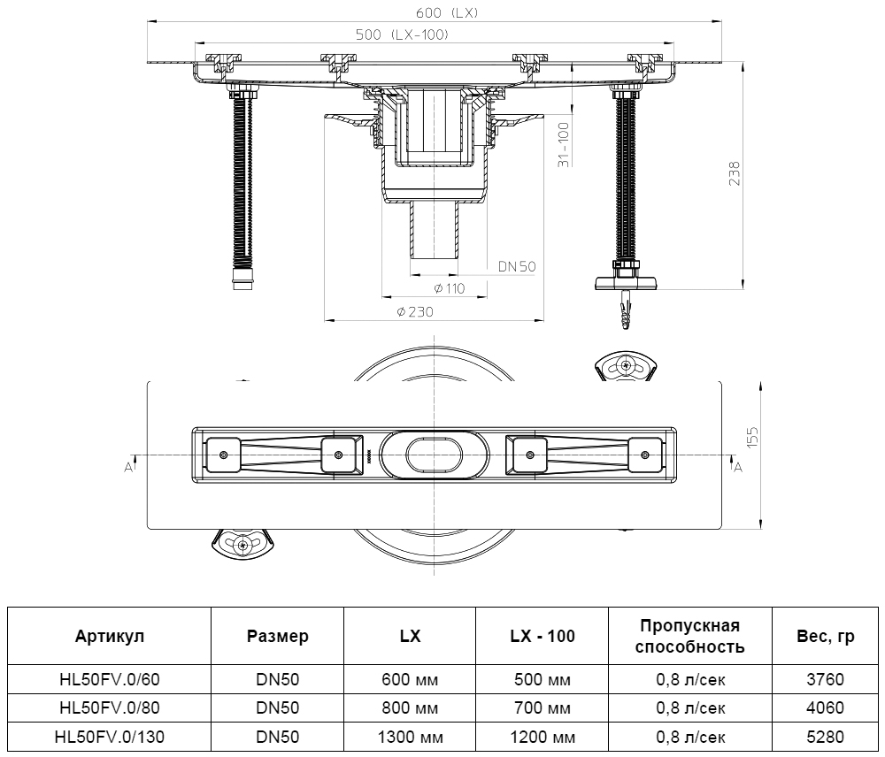 Плоский душевой лоток HL50FV.0/60 DN50 L=600мм Min.высота=31мм, вертикальный выпуск, без решетки