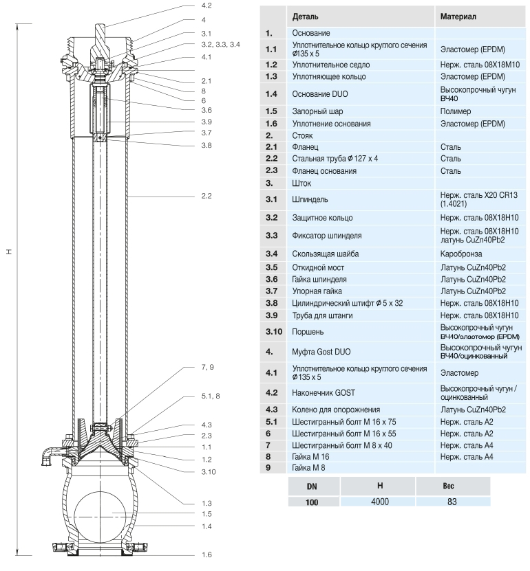 Пожарный гидрант HAWLE DUO-GOST 5035 H=4000 мм подземный с двойным запиранием
