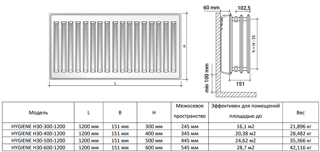 Радиатор панельный Royal Thermo HYGIENE H30-300-1200 RAL9016