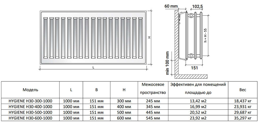 Радиатор панельный Royal Thermo HYGIENE H30-400-1000 Silver Satin