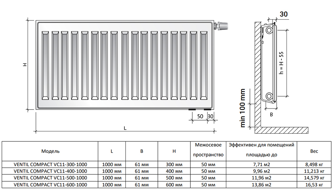Радиатор панельный Royal Thermo VENTIL COMPACT VC11-500-1000 RAL9016 M