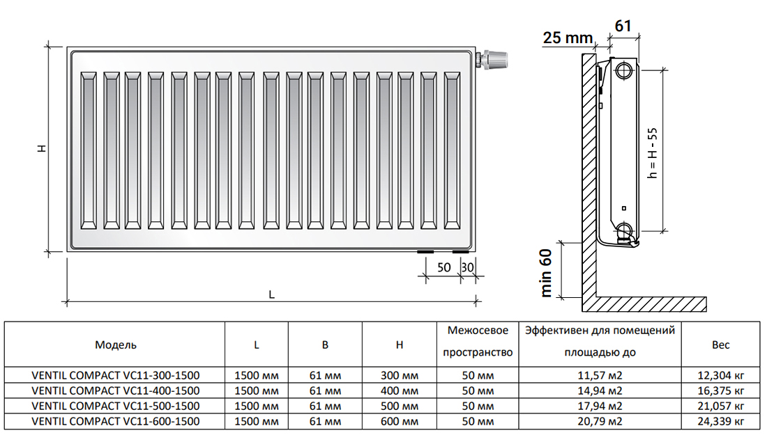 Радиатор панельный Royal Thermo VENTIL COMPACT VC11-500-1500 RAL9016