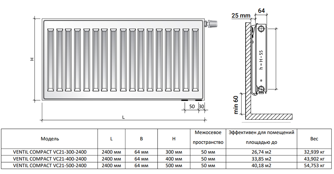 Радиатор панельный Royal Thermo VENTIL COMPACT VC21-500-2400 Noir Sable