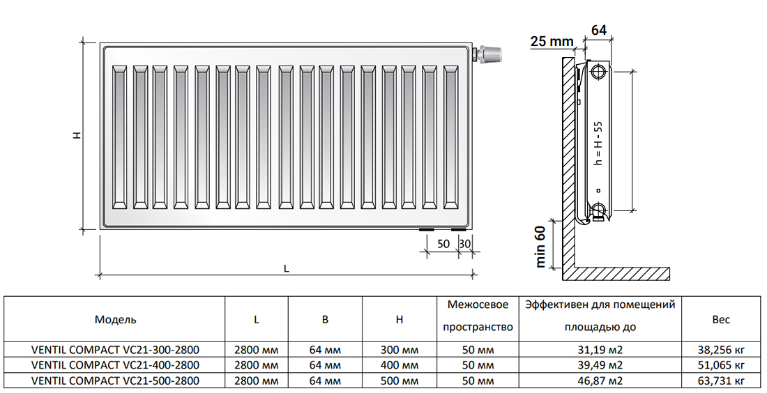 Радиатор панельный Royal Thermo VENTIL COMPACT VC21-500-2800 Noir Sable