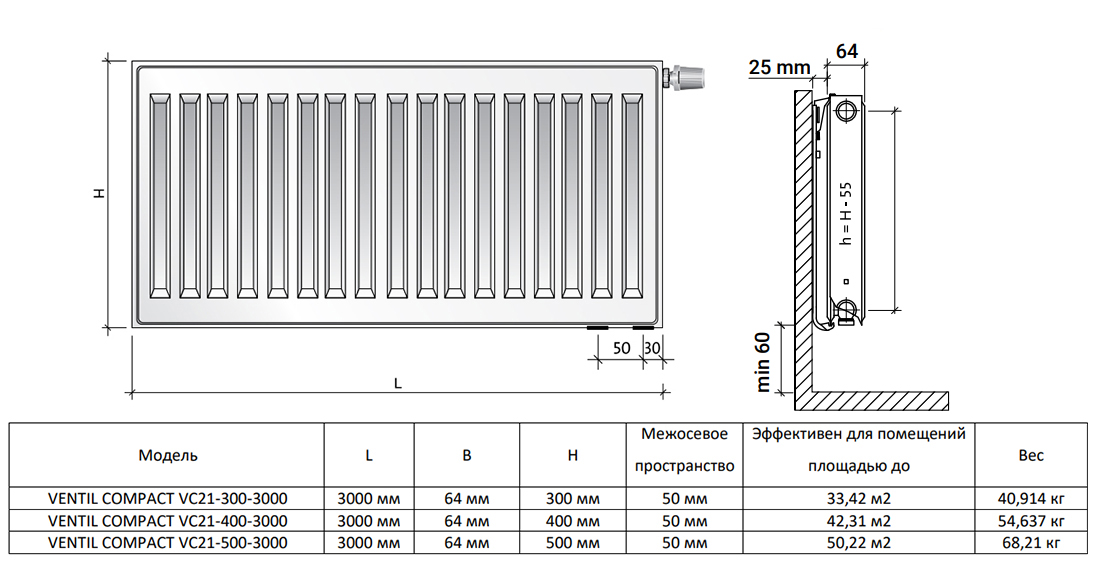 Радиатор панельный Royal Thermo VENTIL COMPACT VC21-500-3000 RAL9016