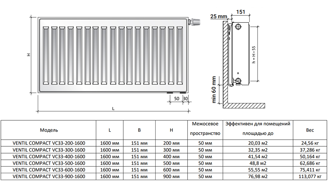 Радиатор панельный Royal Thermo VENTIL COMPACT VC33-200-1600 RAL9016