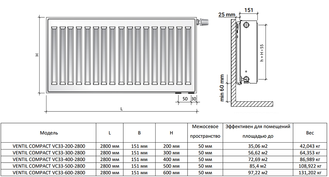 Радиатор панельный Royal Thermo VENTIL COMPACT VC33-400-2800 Silver Satin