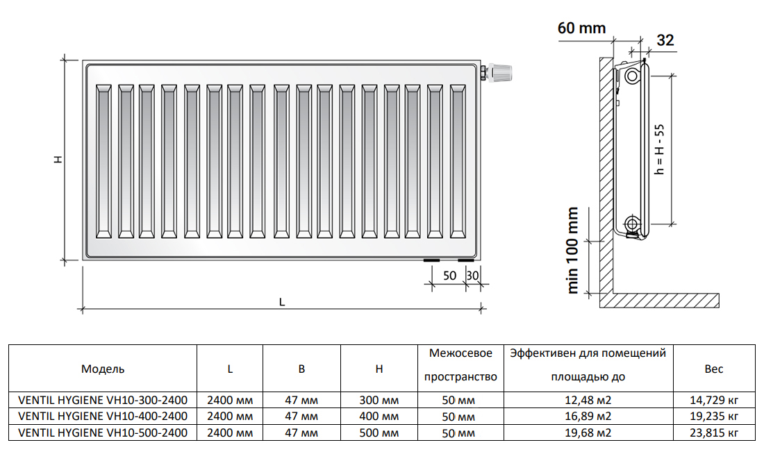 Радиатор панельный Royal Thermo VENTIL HYGIENE VH10-500-2400 RAL9016