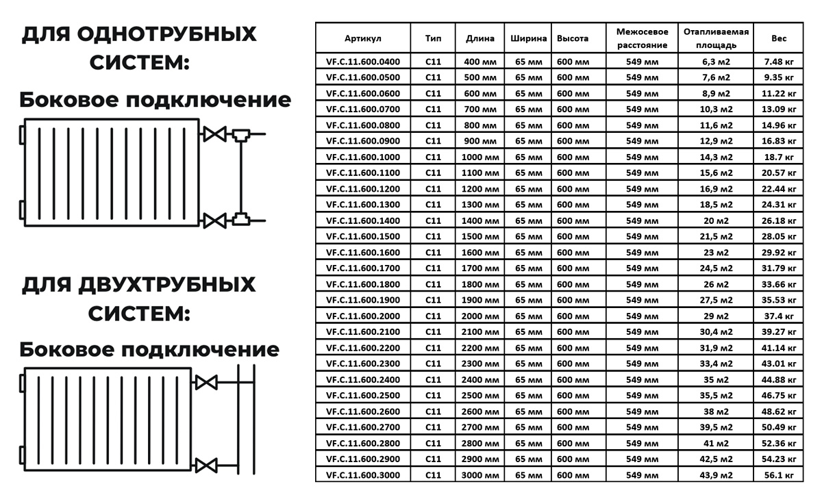 Радиатор панельный VALFEX STEEL C11 400-600 ГОСТ 31311-2005 боковое подключение
