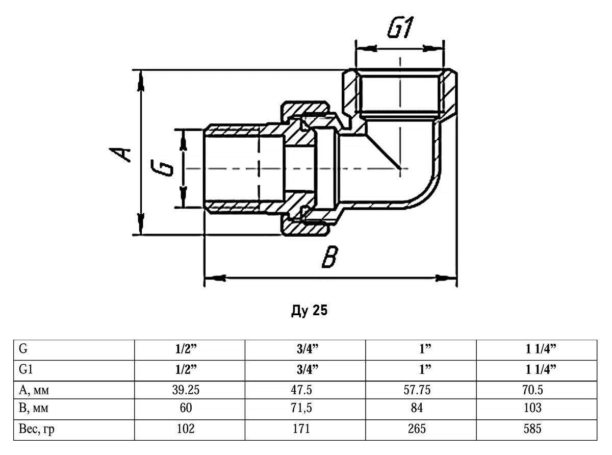 Сгон угловой VALFEX VF.098 ВР-НР 1" Ду 25 Ру 40 разъёмный латунный