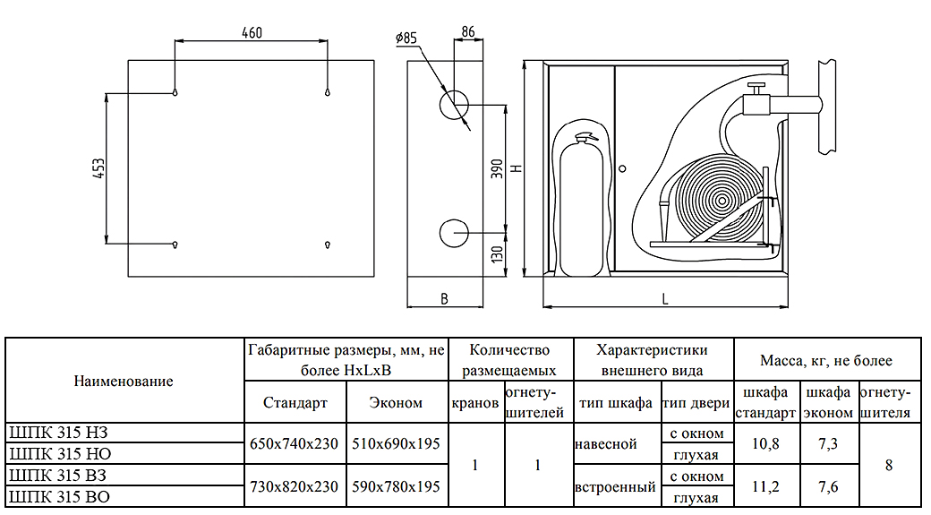 Размещение в пожарном шкафу1 пожарный кран и 1 огнетушитель